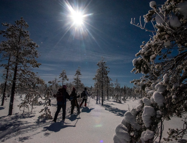 Att åka skidor i skogen i fullmånens sken är förtrollande. Månen lyser upp mer än man kan tro, någon pannlampa behövs inte. Har vi extrem tur kanske ett norrsken också visar sig. En natthimmel fullspäckad med stjärnor är något utöver det vanliga. Om det är mulet kan man ofta se månen ändå, det är faktiskt tillräckligt med ljus för att se var man åker. I mörka partier tar vi pannlampa till hjälp om det behövs. I halvtid stannar vi och gör en eld och kokar kaffe och tevatten, äter medhavd matsäck. Lyssnar på tystnaden eller på någon uggla som hoar.