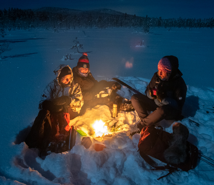 Längd: Turen är cirka 4 km. Det blir flera stopp för att njuta av månskenet, lyssna på tystnaden och känna av magin. När vi åkt lite mer än halva tiden stannar vi och rastar och låter elden värma oss.
